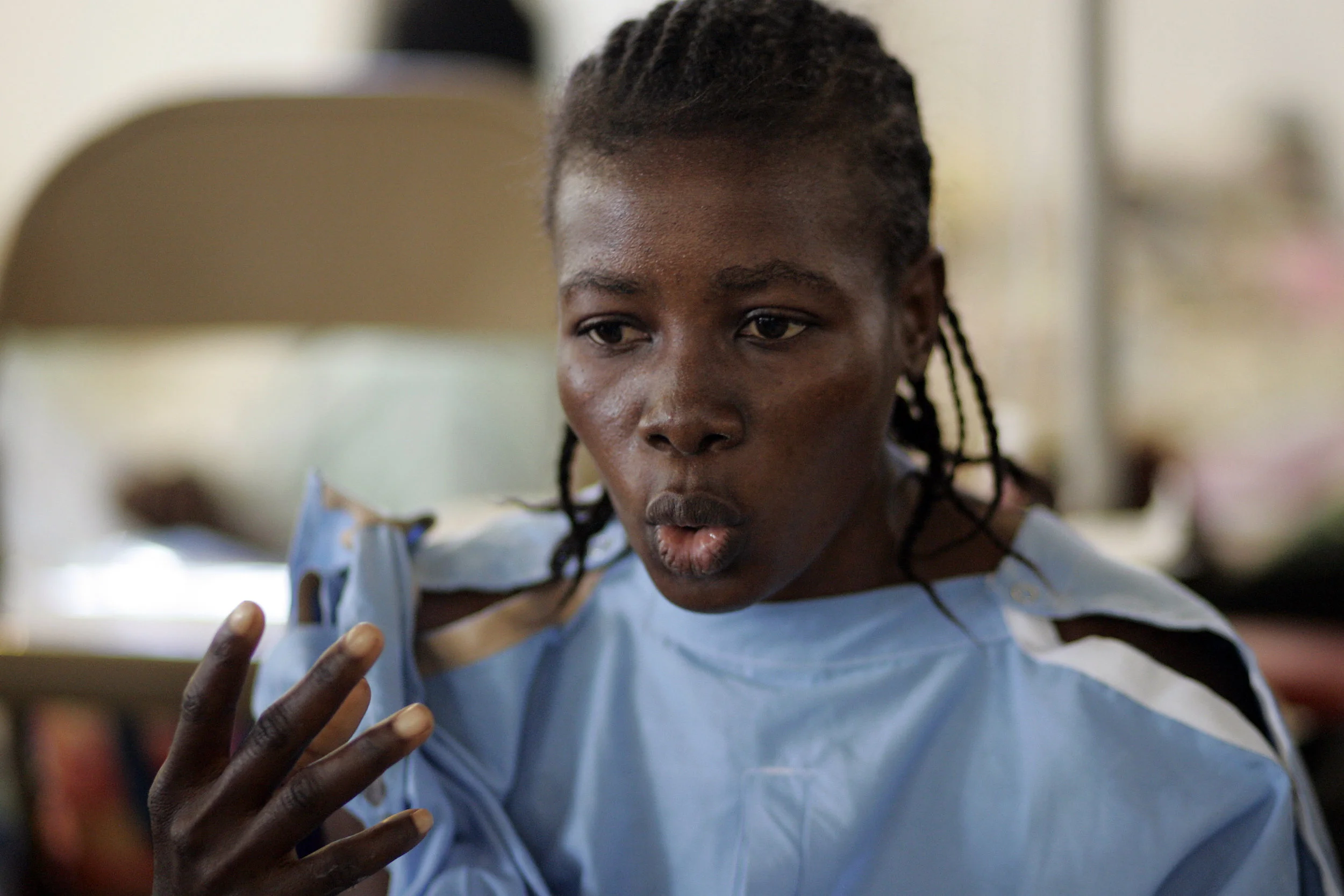 CANGE, Haiti - Dressed in a blue hospital johnny, Sonia Donatien sat on a mattress on the floor of Bon Sauveur's church, her limp left arm lying across her lap.